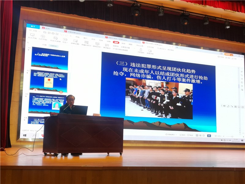 谈主任结合青少年学生的年龄特点,利用鲜活的故事案例,以通俗易懂的语言,深入浅出地向全体师生讲解了导致青少年学生犯罪的原因以及表现出的不良行为等内容,让学生明白哪些行为是触碰不得的法律红线,深刻领悟知法、守法、用法的重要性,倡导学生树立正确的人生观、价值观和世界观,养成良好的生活习惯,健康成长。