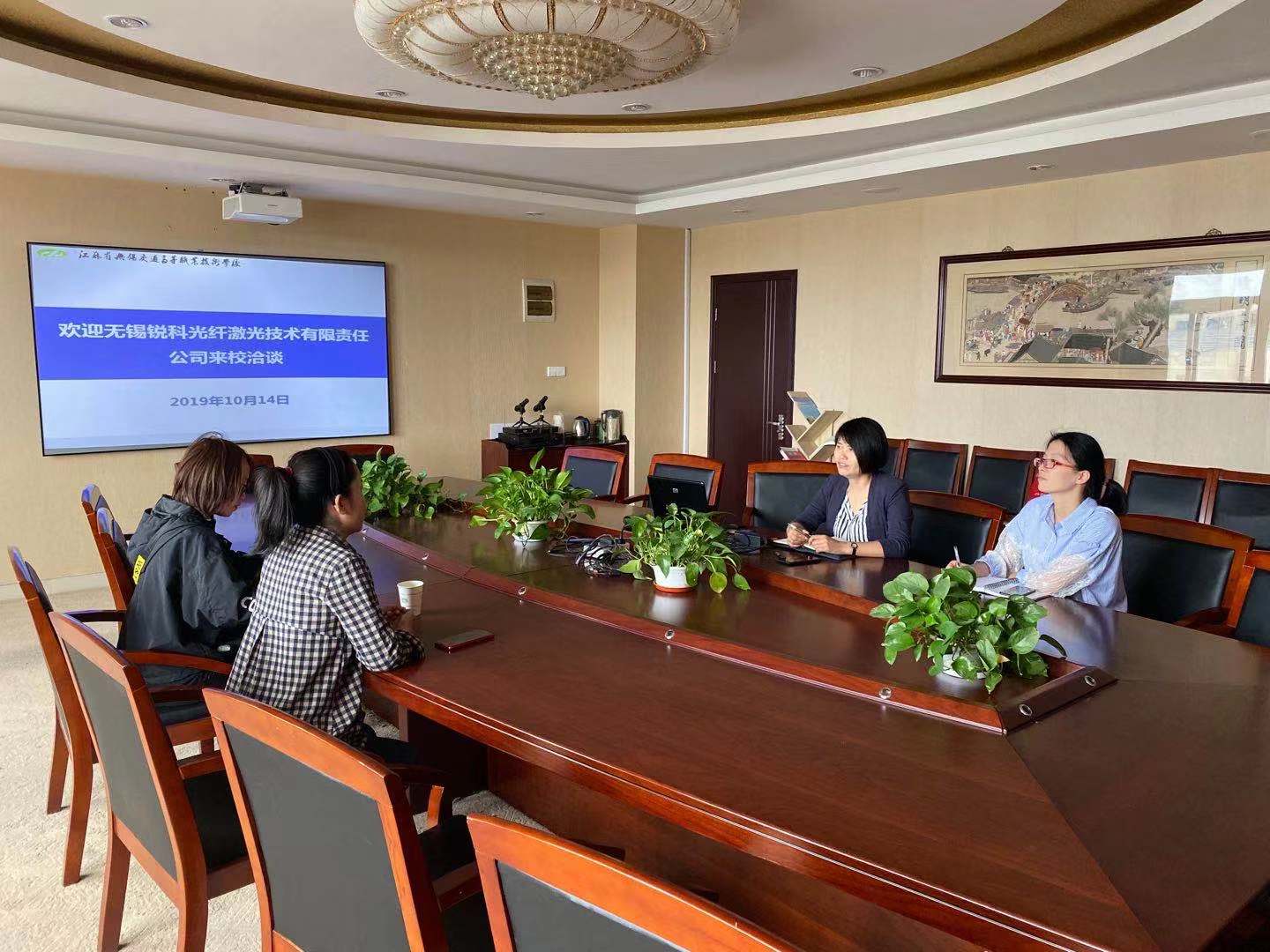 2019年10月14日,无锡锐科光纤激光技术有限责任公司人力资源部陆娜、何媛来校洽谈校企合作及招聘事宜。船舶工程学院党总支书记吴志亚和学工办干事何旭丹进行了接待工作。双方就校企合作方式及具体事项展开了深入交流。