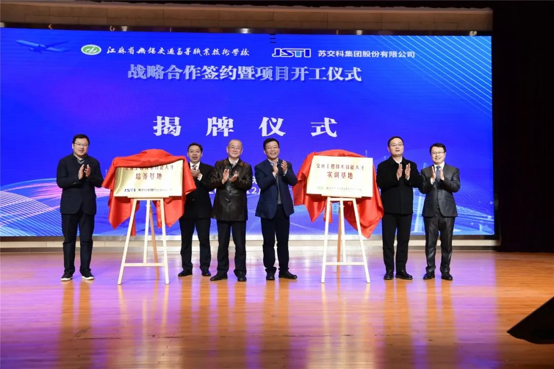 金凌副厅长、夏成满书记、朱晓宁总裁、李虎书记、俞刚局长、惠恭健副局长共同见证战略合作协议的签订,共同为“苏交科集团交通工程技术技能人才培养基地”和“开云手机客户端技术技能人才实训基地”揭牌,并启动生产性交通工程试验检测中心项目开工仪式。