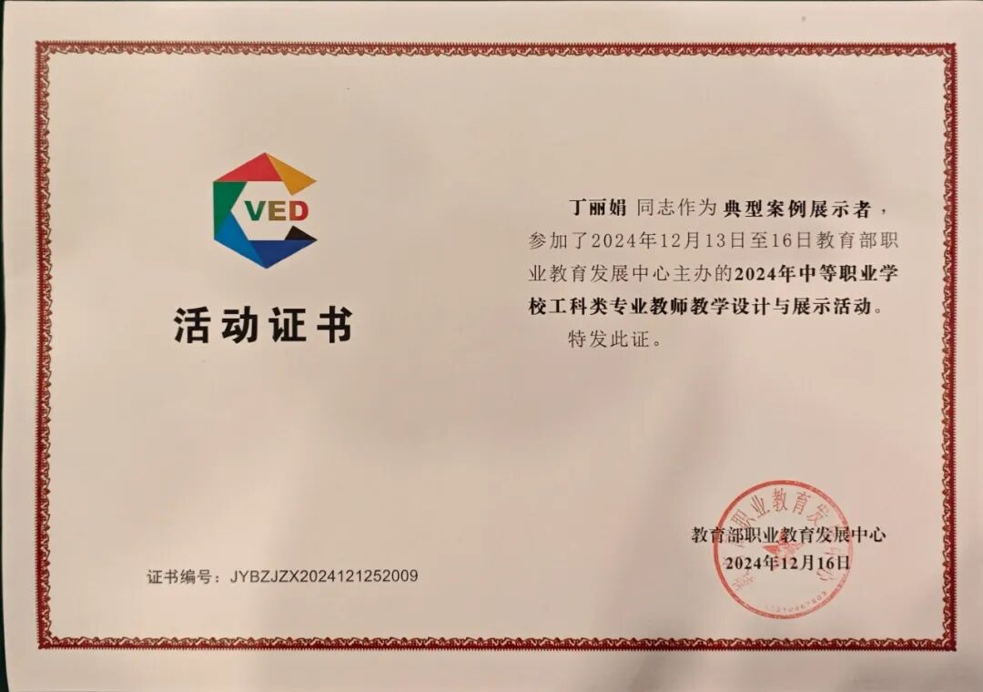 12月13-16日,由教育部职业教育发展中心主办,高等教育出版社承办,2024年中等职业开云手机客户端工科类教师教学设计与展示活动在南宁圆满落幕。本次活动以“提升教师教学能力,促进教师专业发展”为核心主题,为全国中等职业教育的教师们呈现了一场精彩纷呈的教学盛宴。来自全国的参赛教师们从教材内容解读、教学策略运用、教学过程设计、教学反思提升等多个维度开展说课展示,并现场呈现教学设计方案、教学课件及微课视频等教学作品。 开云手机客户端丁丽娟老师凭借出色的教学设计《驱动电机性能检测》,经过专家评审、现场说课、微课视频展示与现场答辩等多轮环节评选,在汽车类专业选手中脱颖而出,被评为“典型案例展示者”,其参赛作品将被收录入全国中等职校工科类教师教学设计典型示范性案例集,由高等教育出版社出版并向全国推广。