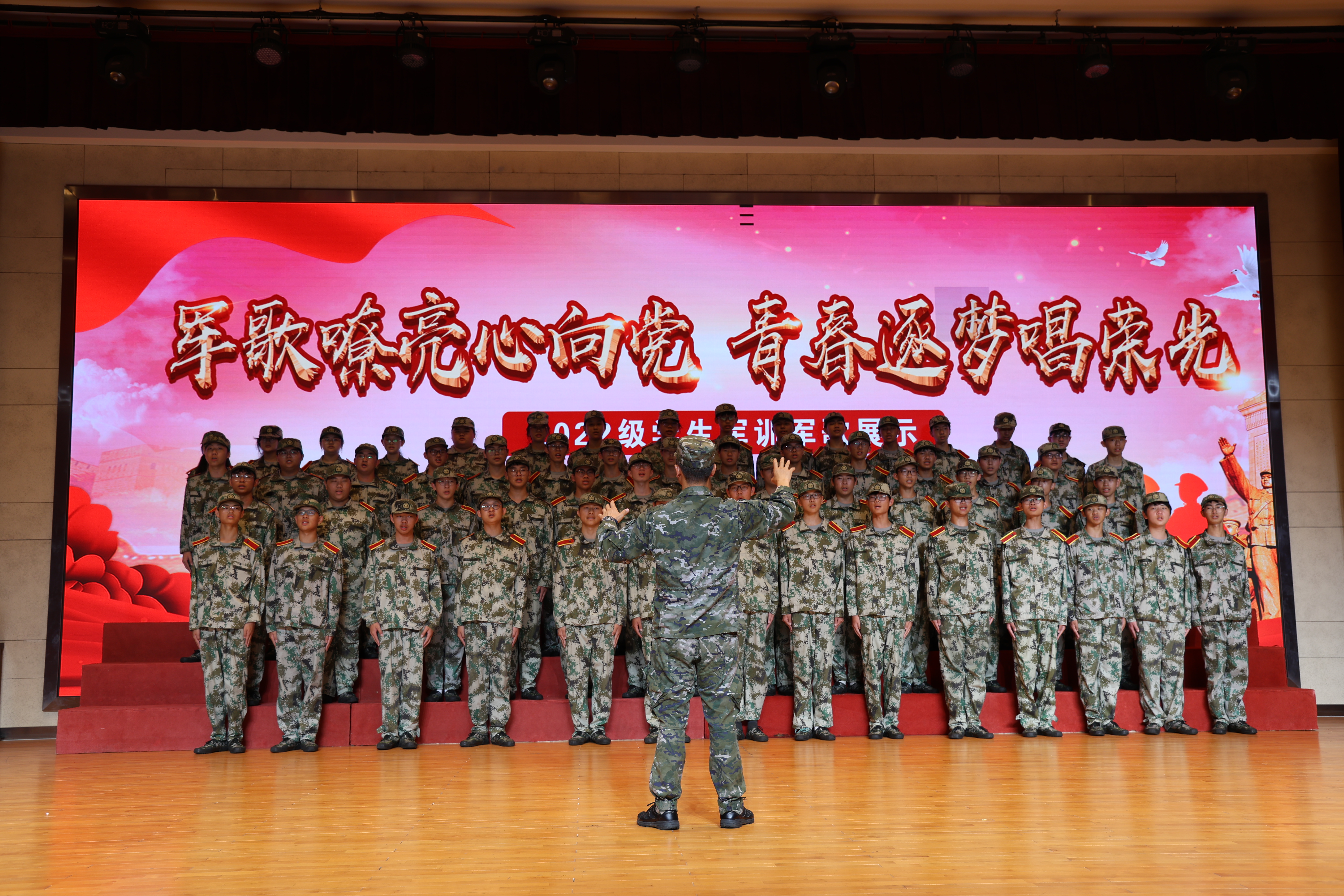 78下午“军歌嘹亮心向党 青春逐梦唱荣光”2022级学生军训军歌展示活动在大礼堂隆重举行。校党委委员、副校长倪依纯出席本次活动,参加活动的还有各学院学工领导、班主任、全体教官及2022级学生