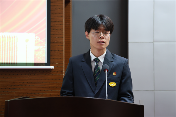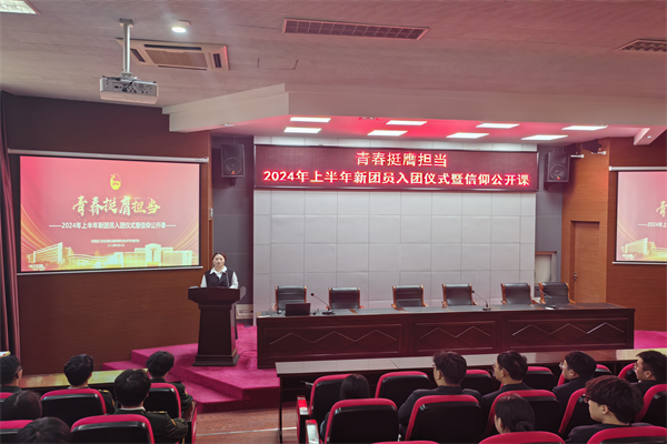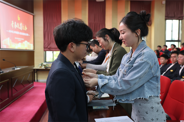 各二级学院团总支书记为新团员代表颁发团员证并佩戴团徽。佩戴着崭新的团徽,新团员们在校团委委员张婷的带领下,面对团旗,举起右手,紧握拳头,庄严宣誓。宣誓声铿锵有力,回荡在报告厅内,表达了新团员们坚定的信念和决心。