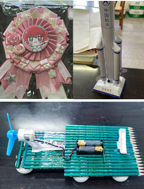 经学院相关教师严格评选,最终评出202712班汪会云等同学合作的《剪纸》、211711班吕雪同学《永不凋谢的向日葵》获一等奖、212711班金晨同学《火箭》、201711张漪岚同学《蜜糖玫瑰》、202711蒋艳同学《晴天娃娃》获二等奖、202711班张世豪同学制作的《艺术之花》、212711班张俊康同学制作的《电动船》、211711王文静等同学合作的《小家》、202711班孙慧姿同学《蓝盒子》获三等奖。