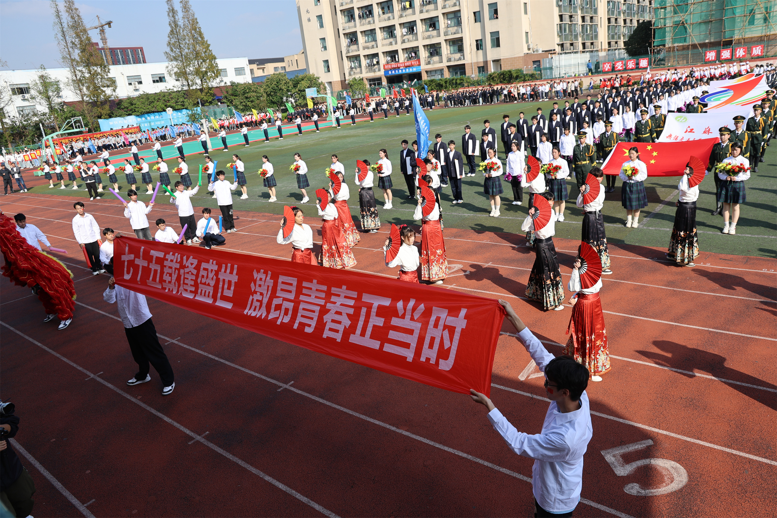 在激昂的运动员进行曲中,师生代表列着整齐的方阵,迈着矫健的步伐,依次通过主席台,逐一亮相。各方阵带着精心准备的节目,他们的表演独具匠心,他们的口号激扬振奋,他们的誓言铿锵有力,在主席台前一展才艺和创意。