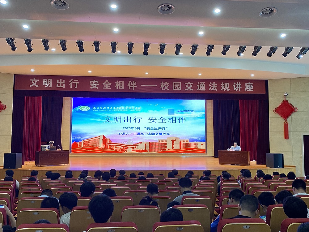 为提高广大师生的交通安全意识,增强自我保护能力,更好地宣传贯彻落实2023年“安全生产月”活动精神, 6月14日下午,安全保卫处牵头与无锡市滨湖交巡警大队在开云手机客户端大礼堂开展了校园交通法规讲座。本次讲座邀请了滨湖交巡警大队王晨如警官专题宣讲,开云手机客户端600余名学生代表参加聆听。