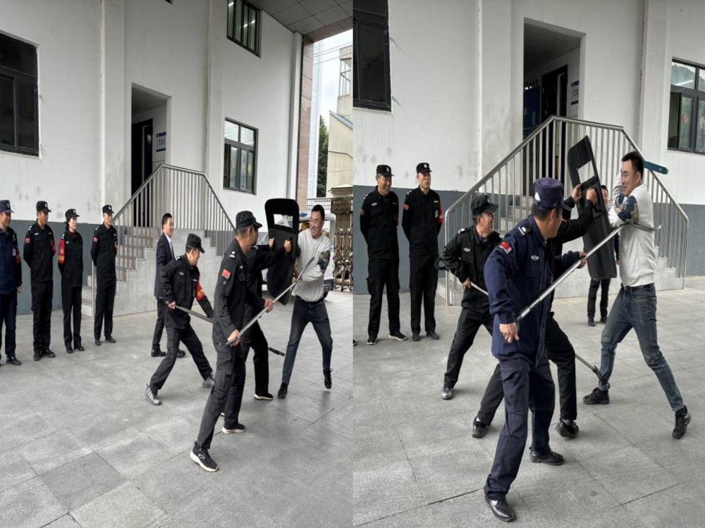 安全保卫处与银城保安服务公司检查了防爆器材,教员为安保人员详细讲解了个人技能战术,结合实际案例,深入浅出地介绍了各类防暴器械的使用方法和防暴技能。特别强调了在使用安保器械如盾牌、钢叉时,如何在保证自身安全的前提下,进行制式装备的单兵使用和组合使用,以达到最佳的防御和制服效果。 为了让演练更加贴近实战,活动设置了模拟场景,一名由工作人员假扮的“歹徒”突然闯入校园,安保人员面对这一突发情况,迅速反应,第一时间按下了一键报警系统。校方在接到报警后,立即启动了反恐防暴应急预案,几名安保人员紧密协作,共同阻挡并制服“歹徒”。