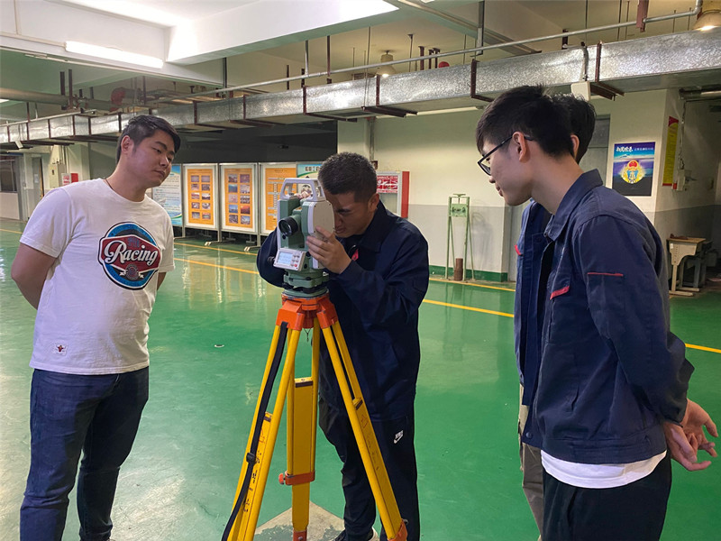 本次比赛共有来自船舶工程学院轮机工程技术专业171141班11名同学参加。比赛要求学生利用激光电子经纬仪(LT 402L)及其三角支架、标尺、卷尺、水平尺和扳手等工量具根据轴系布置图和赛场给定的标记点,确定尾基点的位置,再操作使用激光经纬仪建立轴系理论中心线,调整尾轴管位置,最终使尾轴管中心与轴系理论中心线同轴。