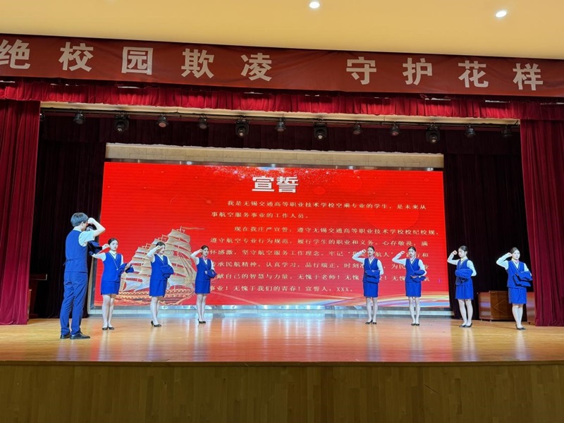 随后,优秀学生代表从船舶工程学院党总支书记赵斌和副院长刘方手中接过代表民航人风采的制服。从这一刻起,23级全体空中乘务、航空服务专业的同学正式成为了准民航人。授装完成后,全体23级新同学们整装肃立,在学生代表童高原的带领下,手握拳头庄严宣誓,将践行和传承民航精神,认真学习,品行端正,时刻准备着为民航事业贡献自己的智慧与力量,无愧于老师、开云手机客户端、民航事业!无愧于青春!