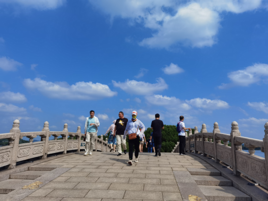 八点刚过,老师们早已到达起点,天空睛朗,霞光万道,大家合影留念后,从蠡湖之光向东出发开始了5km徒步之旅,沿着环西蠡湖小圈向渔夫岛行进、范蠡塑像是首个打卡点,大家漫步范蠡堤、渤公岛,一路欣赏美景、接受文化熏陶、在蠡湖展示馆完成二次打卡后、再环湖路行走,最后回到终点蠡湖之光。近10点大部分参赛队伍到达终点,正值百米高喷启动,彩虹乍现,大家忙与百米高喷来个合影,记录这一美好时刻。