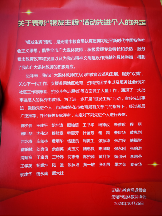 “银发生辉”活动,是无锡市教育局认真贯彻习近平新时代中国特色社会主义思想,倡导全市广大退休教师,积极发挥专业特长和余热,服务教育改革和发展以及为精神文明建设作贡献的具体举措,得到了全市广大退休教师的积极响应。2023年10月26日无锡市教育局退管会、无锡市退休教师协会、市教育局有关部门,在市夕阳红老年大学对近50名老师进行表彰,我校王建平老师获评无锡市“银发生辉”活动先进个人。
