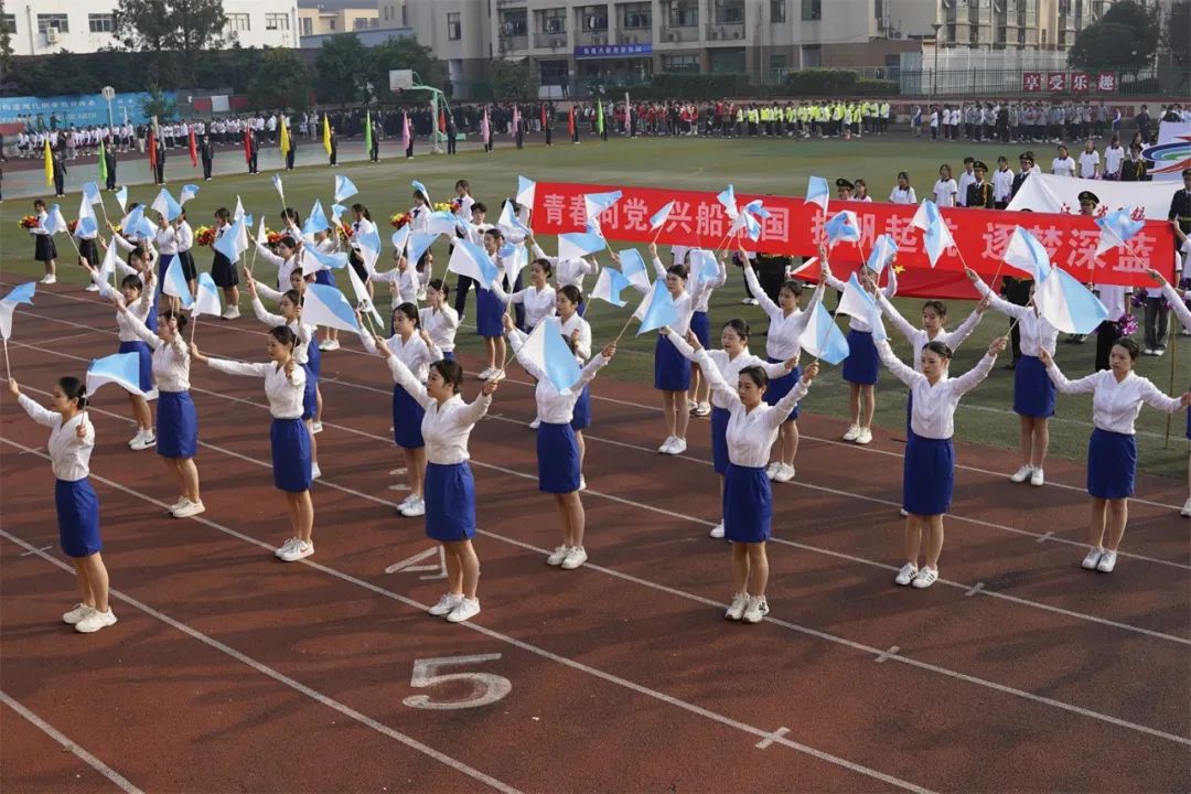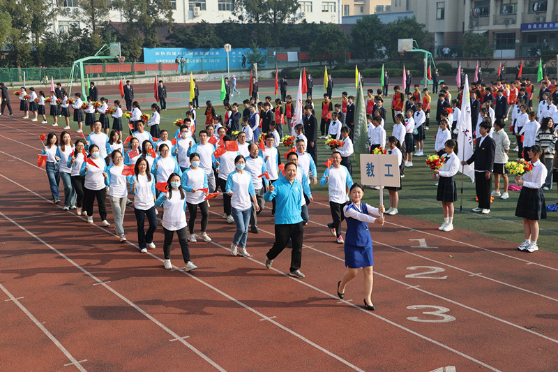 在激昂的运动员进行曲中,师生代表摆着整齐的方阵,迈着矫健的步伐,依次通过主席台,逐一亮相。各方阵带着精心准备的节目,他们的表演独具匠心,他们的口号激扬振奋,他们的誓言铿锵有力,在主席台前一展才艺和创意。