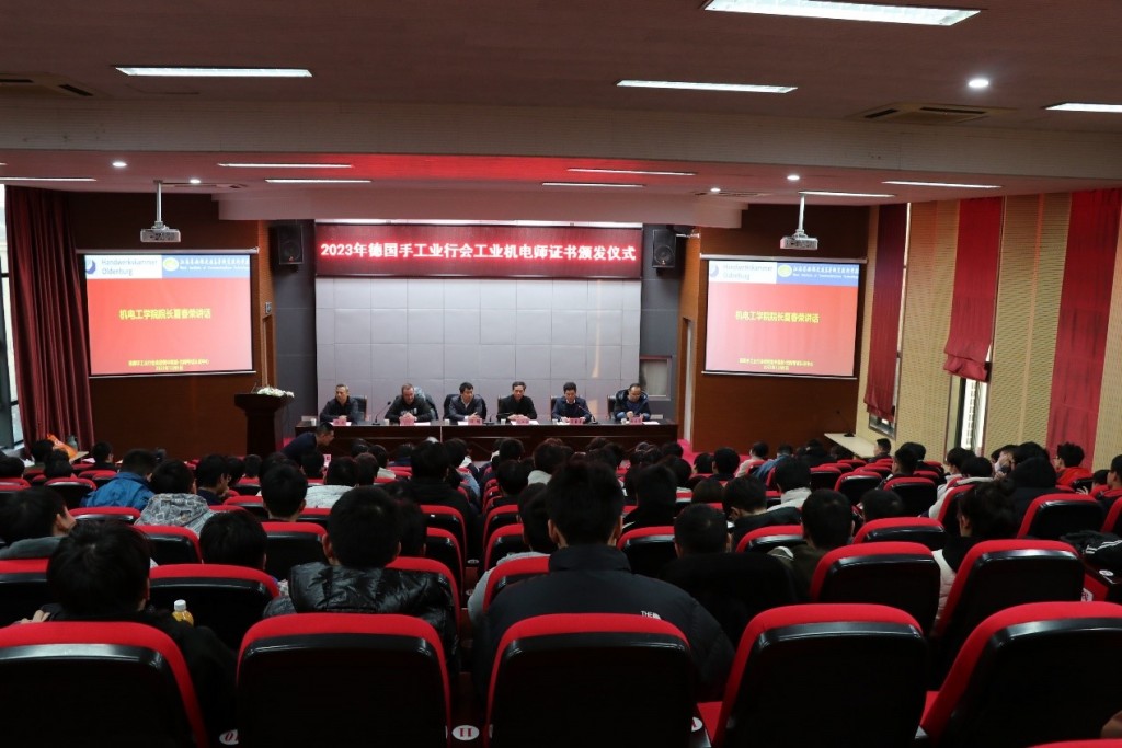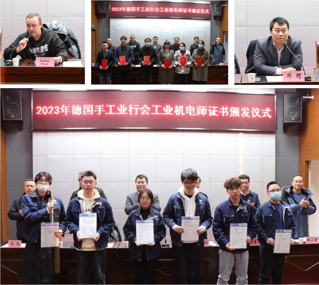 为总结中德班教学成果,表彰表现优异的学生、教师,激励更多中德班学生踔厉奋发,勇毅前行,12月5日,德国手工业行会中国项目办与开云手机客户端联合举办了2023年德国手工业行会工业机电师证书颁发仪式。