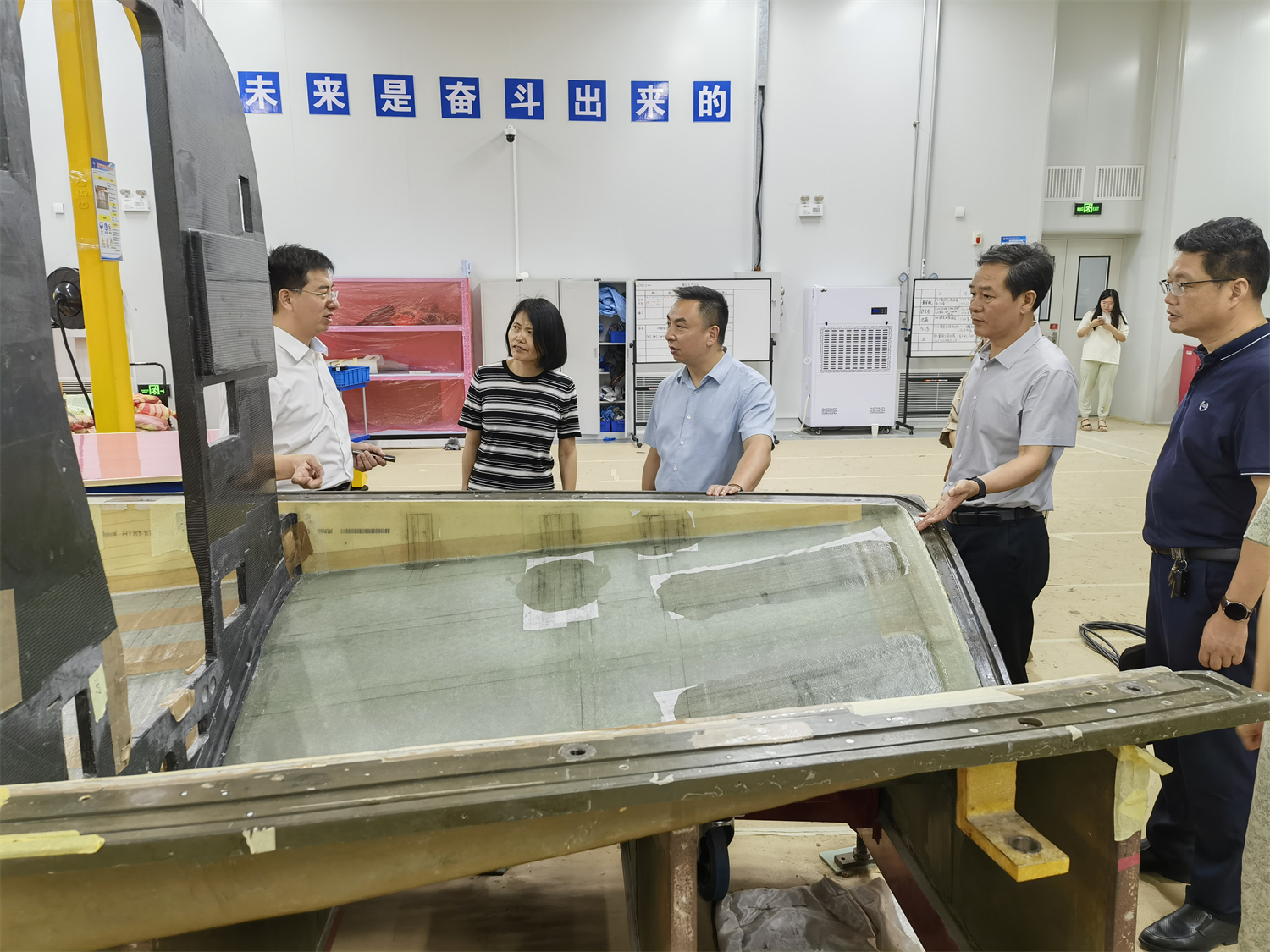 在道尼尔海翼无锡有限公司,崔益华总经理陪同李进一行参观了公司陈列馆以及公司在研机型海星样机,实地走访了总装车间,了解飞机复材部件、航电线束等生产安装情况,听取了道尼尔海翼的企业发展运行情况以及海星项目的进展情况。