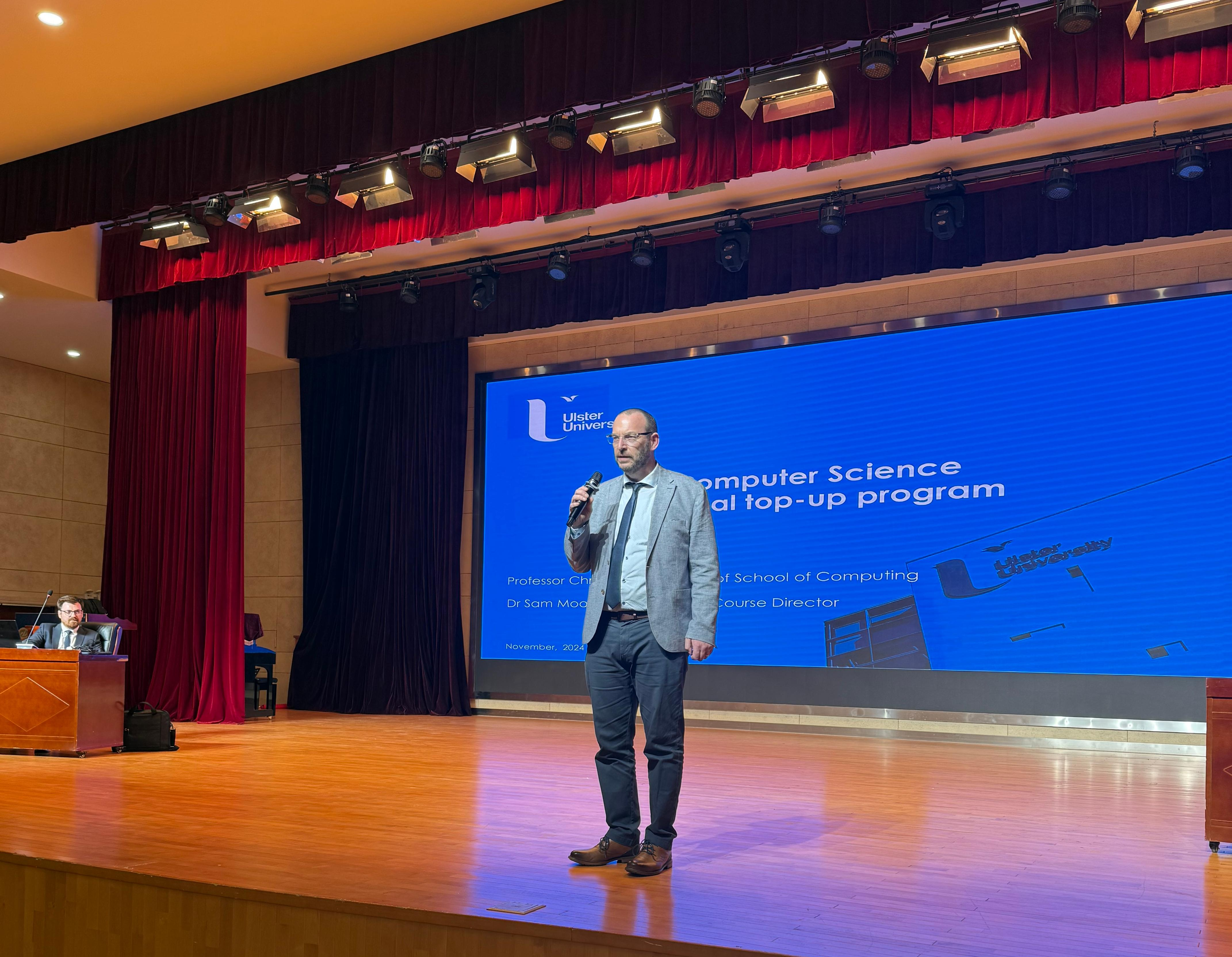 Chris院长表示期待能与我校建立紧密的合作关系。他表示,奥斯特大学一直致力于推动全球教育的多元化和国际化,双方有着共同的教育初心和目标。希望依托两校在中英两国教育、科研、文化交流等领域的丰富资源,探讨开展更加多样、更加务实的交流与合作,培养具有国际化视野的精英人才。随后,Chris Nugent院长一行还专门给部分学生作了奥斯特大学基本情况的宣讲。