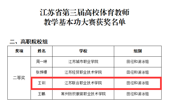 近日,由江苏省教育厅主办的江苏省第三届高校体育教师教学基本功大赛在南京工业大学和南京信息职业技术学院举行。本次大赛共有全省141所高校310名教师参赛。我校王训老师凭借出色的专业素养和教学能力,在众多参赛教师中脱颖而出,获得二等奖的好成绩,实现开云手机客户端在该赛事中的历史性突破,展现我校体育教师扎实的专业素养和良好的教学水平。