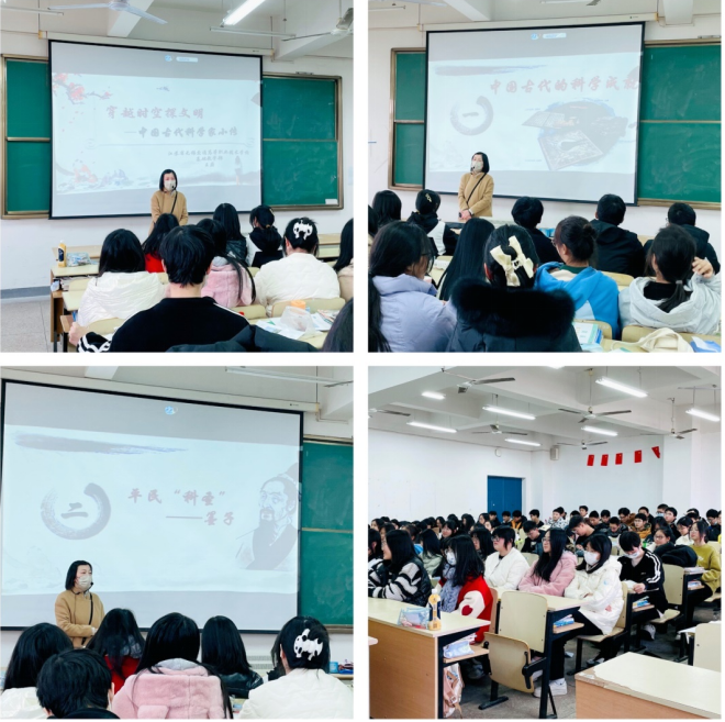 为弘扬中华优秀传统文化,提升学生科学素养,激发学生向上、向善、向美的力量,11月30日,理化教研室王蔚副教授开展了“穿越时空探文明——中国古代科学家小传”的讲座,来自物流、信息等学院的百余名师生聆听了讲座。
