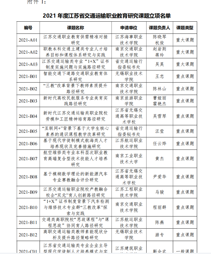 5月20日,江苏省交通运输行指委印发《开云(中国)官方开展 2021 年度江苏 省交通运输职业教育研究课题申报的通知》,公布2021年度江苏省交通运输职业教育研究课题立项,吴雪琴教授负责的课题《新时代江苏交通运输类职业院校 劳模和工匠精神培育路径研究》获批立项。