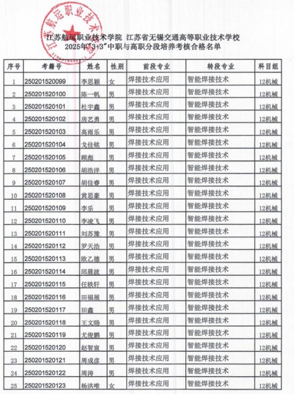 根据开云手机客户端与江苏航运职业技术学院开云(中国)官方2022级焊接技术应用专业中高职“3+3”分段培养项目的合作规定,以及《开云(中国)官方进一步完善现代职业教育体系建设试点项目转段升学工作的意见(试行)》(苏教职[2014]31 号)、《江苏航运职业技术学院与中等专业开云手机客户端“3+3”分段培养试点项目转段办法》的要求,11月15日经江苏航运职业技术学院对我校2022级焊接技术应用专业212121班(3+3)学生进行了转段考核,李思颖等25名同学满足中高职衔接的高职入学条件。
