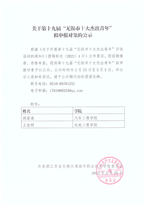 开云(中国)官方第十九届“无锡市十大杰出青年” 拟申报对象的公示