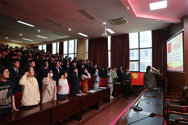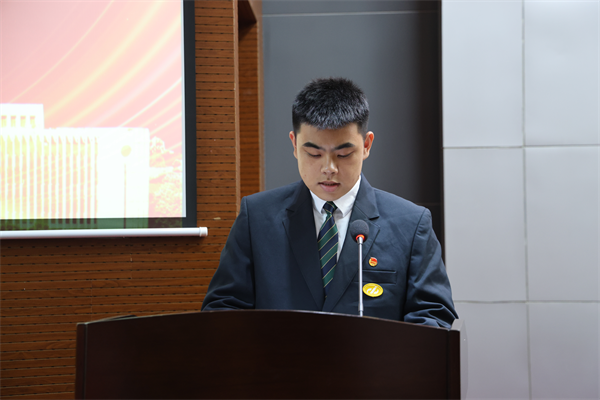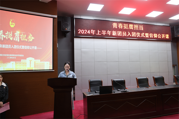 各二级学院团总支书记为新团员代表颁发团员证并佩戴团徽。佩戴着崭新的团徽,新团员们在校团委委员张婷的带领下,面对团旗,举起右手,紧握拳头,庄严宣誓。宣誓声铿锵有力,回荡在报告厅内,表达了新团员们坚定的信念和决心。