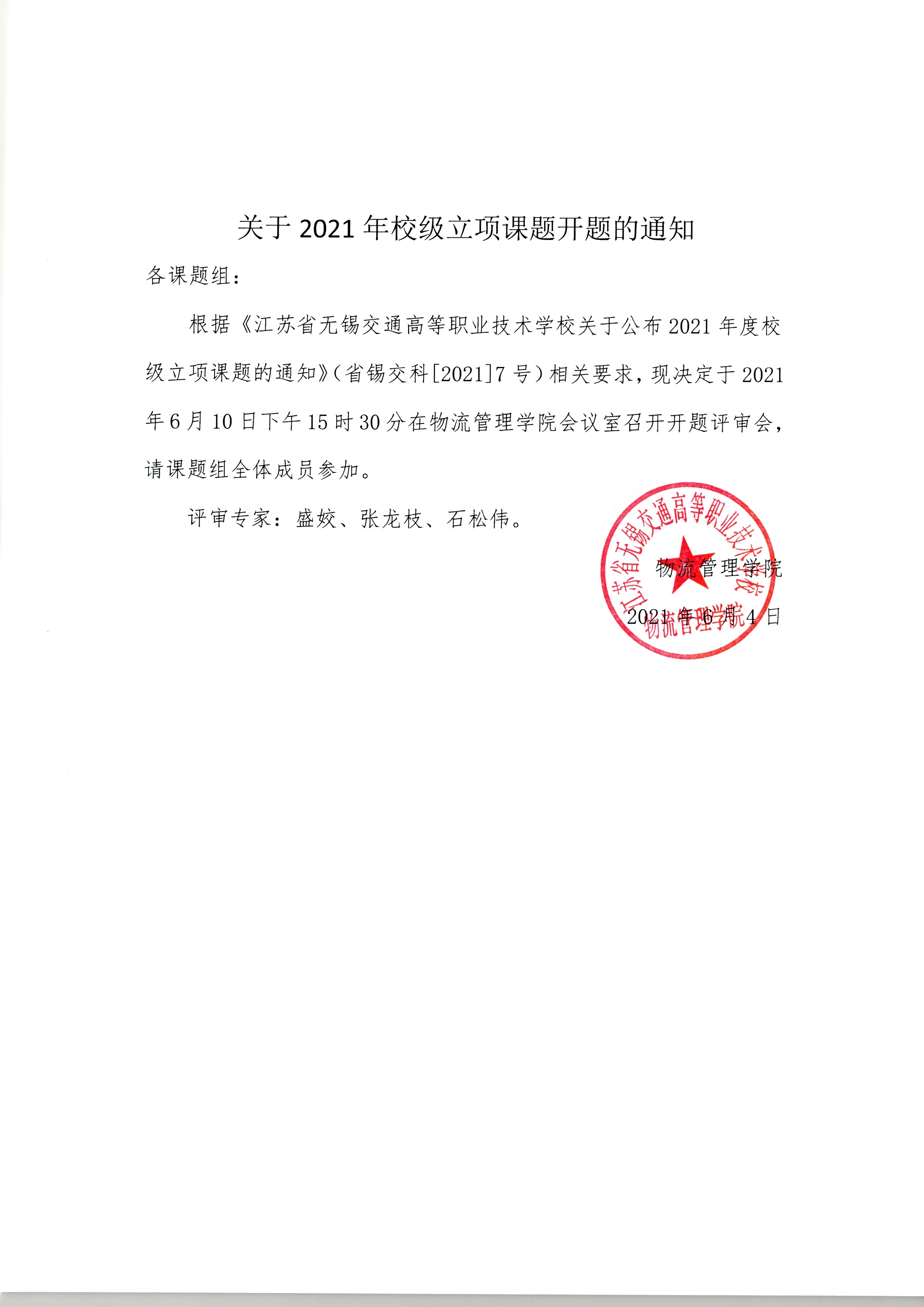 根据《开云手机客户端开云(中国)官方公布2021年度校级立项课题的通知》(省锡交科[2021]7号)相关要求,现决定于2021年6月10日下午15时30分在物流管理学院会议室召开开题评审会,请课题组全体成员参加。