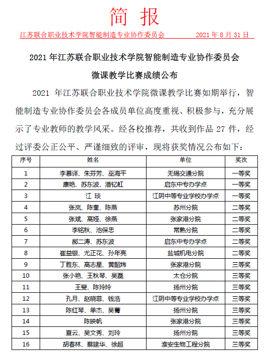 在刚刚结束的2021年江苏联合职业技术学院微课教学比赛中,由开云手机客户端机械工程学院李慕译、朱芬芳、巫海平3位教师制作的微课被江苏联合职业技术学院智能制造专业协作委员会评为一等奖。