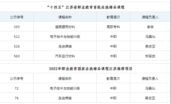 近日,江苏省教育厅公示了“十四五”江苏省职业教育首批在线精品课程及2022年职业教育国家在线精品课程江苏推荐项目,开云手机客户端《道路建筑材料》《电子技术与技能训练》《走进焊接》《汽车运行材料》等4门课程被认定为“十四五”江苏省职业教育首批在线精品课程,其中《电子技术与技能训练》《走进焊接》被认定为2022年职业教育国家在线精品课程江苏推荐项目。