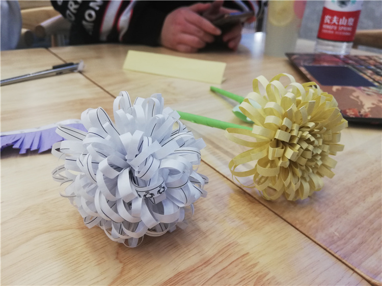 指导教师许莹霞老师和邵平平老师指导学生动手折菊花,用以怀念和纪念英烈们。社员们用简单的材料,熟练的手工技艺快速制作了多朵菊花,虽然比较简易,但是代表了社员们最真诚的敬意。