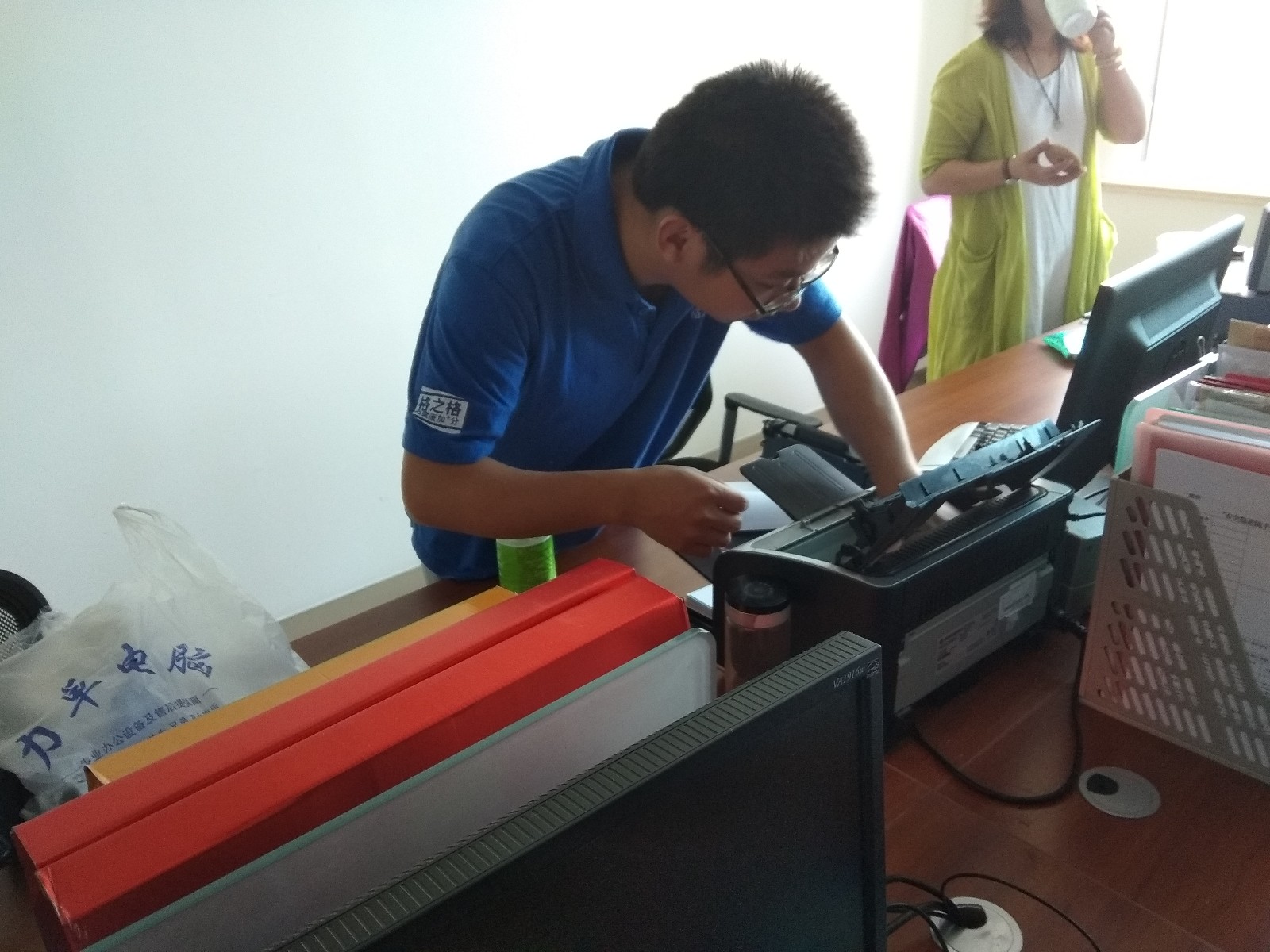 昨天,苏宁易购大客户服务中心一行三人来到我校钱荣校区,为校区教职工提供免费清理、维护打印机服务。